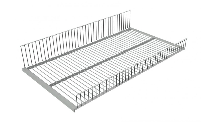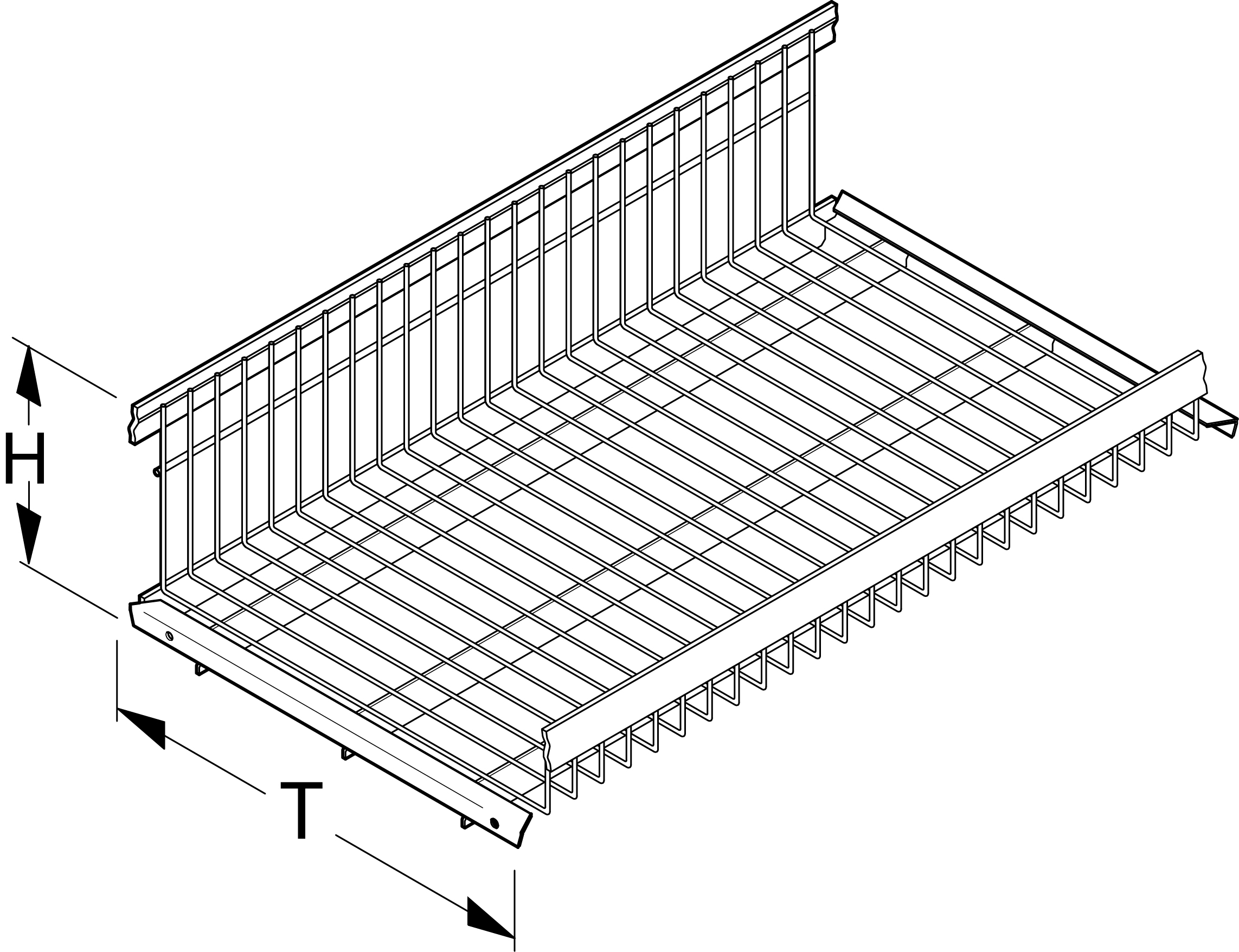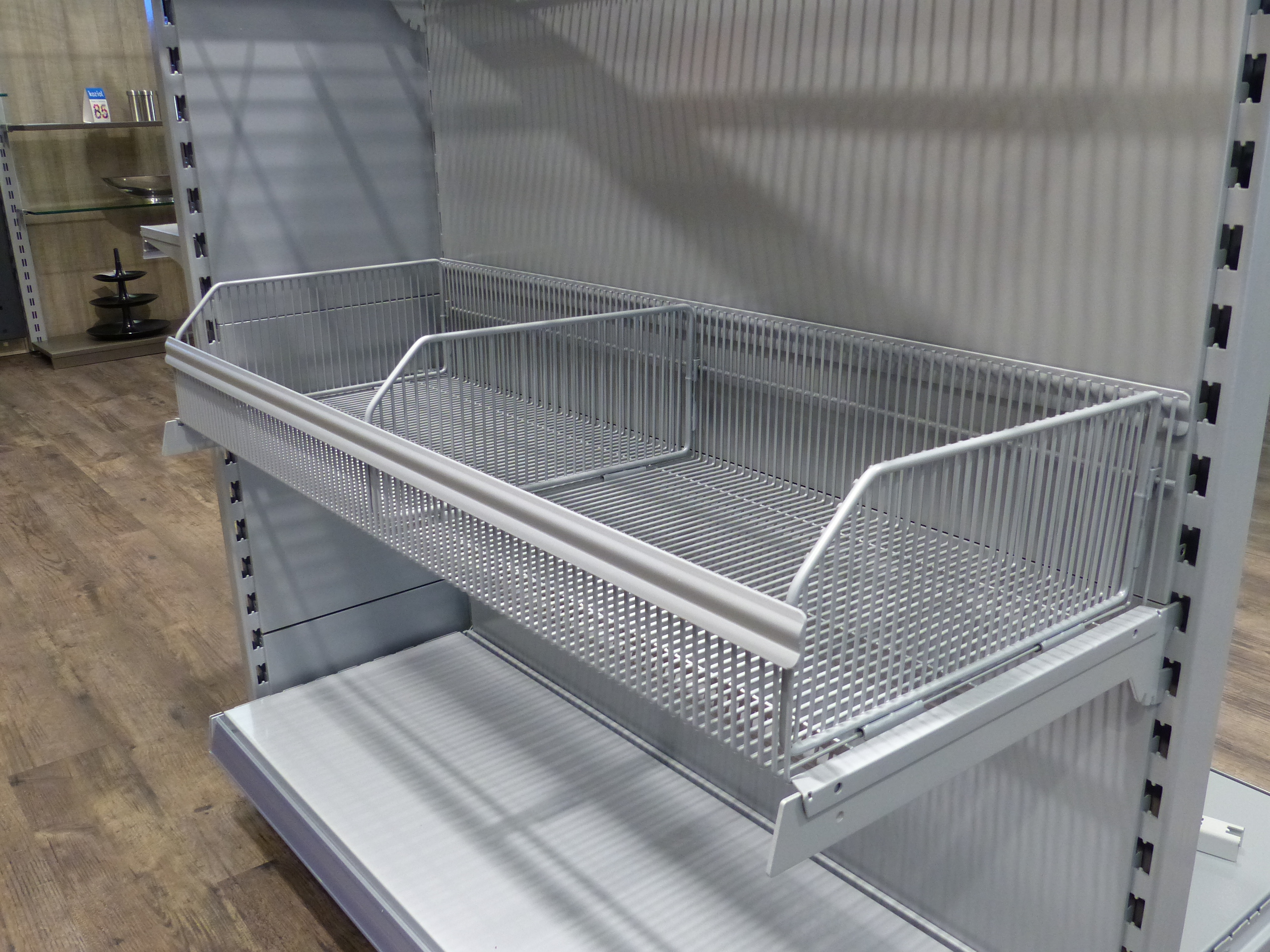 mit einer vorderen Aufkantung von 15cm und einer hinteren Aufkantung von 10cm. Der Korb ist drehbar, d.h. man kann ihn beidseitig einhängen und auch von beiden Seiten eine Scanningpreisschiene anbringen. Farbe RAL 7035 lichtgrau